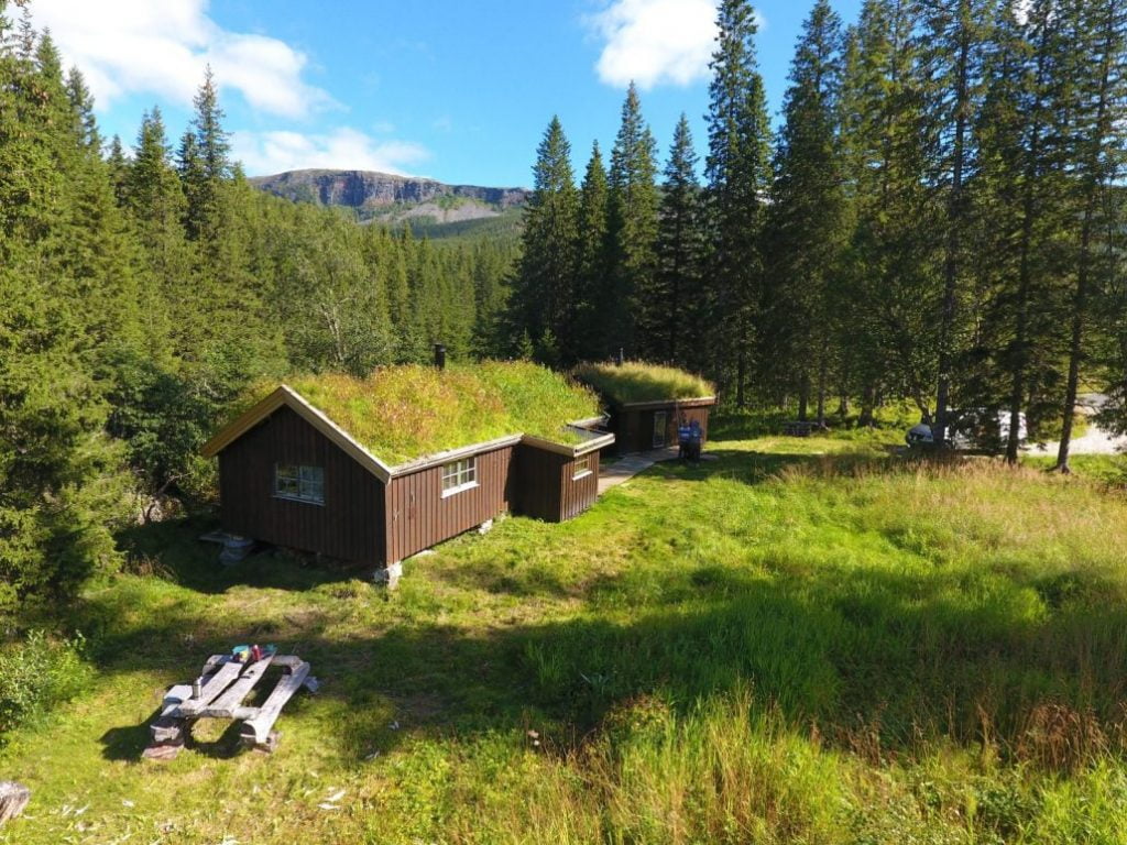 Standing outside the cabin or looking out the window, you have spruce and fir forest, but towards the water, there is a large open field with the Sørengvatn lake and the Søberg waterfall in the background.