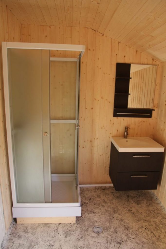 Running water in washroom/ shower room. Propane burner and a wood-burning stove/oven. Propane fridge. Kerosine lamps in the cabin. An aluminium box is buried in the marsh behind the cabin and works as a cellar.